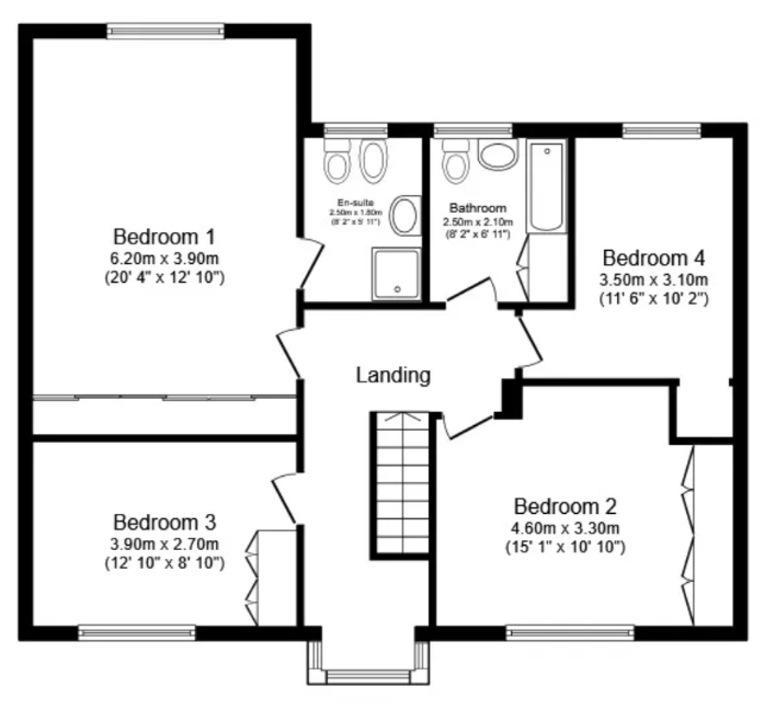 6.2mx3.9m The master bedroom is equipped with fitted wardrobes, a double glazed window, power outlets, a ceiling light, and direct access to the en suite.
