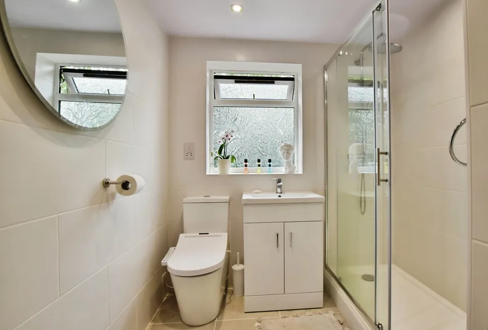 Recently refurbished in a stunning white finish with contemporary fixtures and fittings, this space features a shower cubicle, tiled walls, a wash basin with vanity storage beneath, a low-level WC, a bidet, and a double-glazed window.
