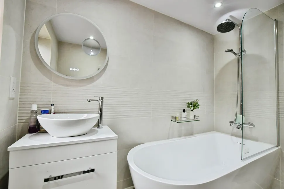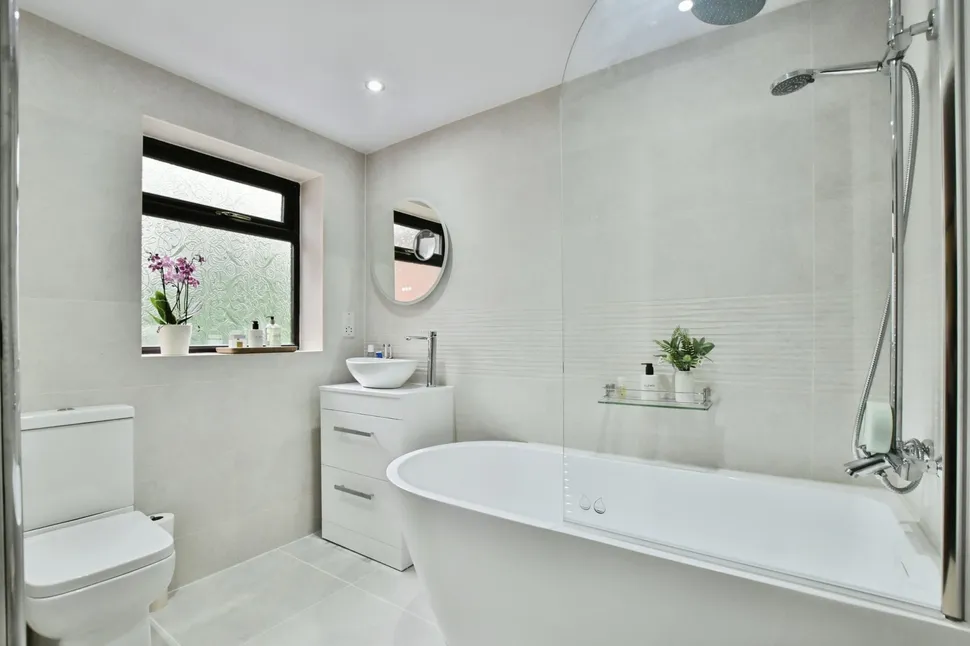 The master bathroom has recently been finished to a contemporary, high standard, featuring a modern bath, low-level WC, and a sleek wash basin. Stunning floor-to-ceiling tiles create a fresh, luxurious feel, complemented by a louvre-fronted storage cupboard perfect for towels and accessories. A frosted double-glazed window provides privacy while allowing natural light to flow in, and the panelled ceiling with embedded spotlights completes the space in a beautiful crisp pearl white finish.