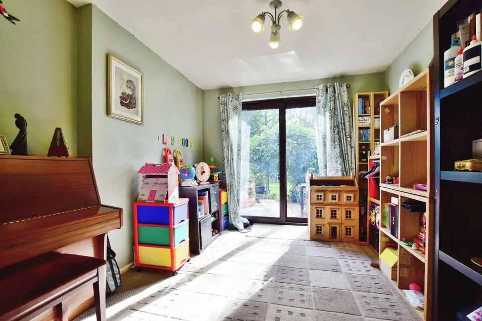 4mx3m The sitting room has been arranged as a child's playroom, making it an ideal third reception area, complete with sliding doors leading to the rear garden, power outlets, a radiator, and ceiling lighting.